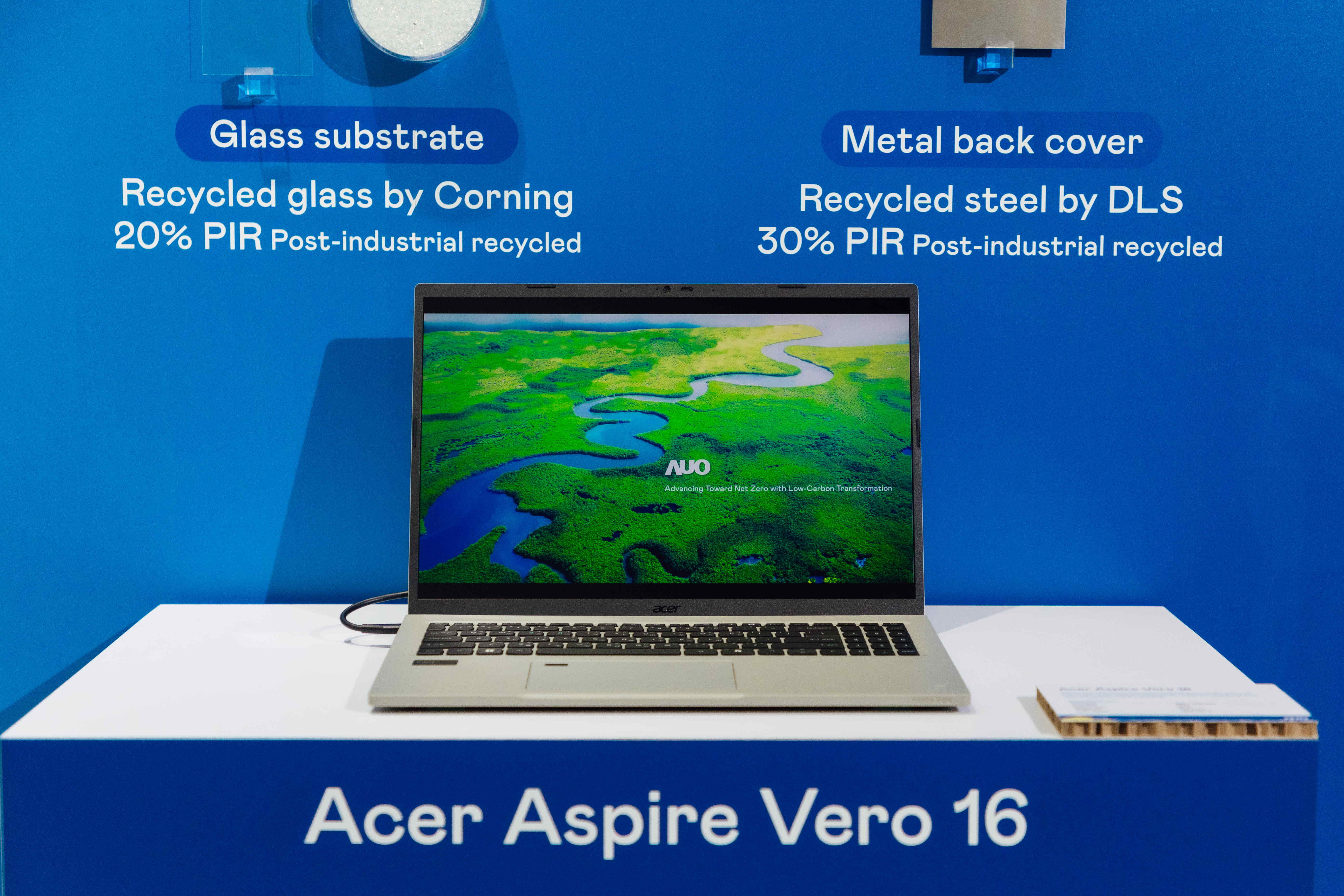 The world's first notebook computer adopted a panel produced by AUO with 100% green electricity. In addition to PCR, it also uses post-industrial recycled materials (PIR), such as recycled glass and metal, to reduce its impact on the environment.