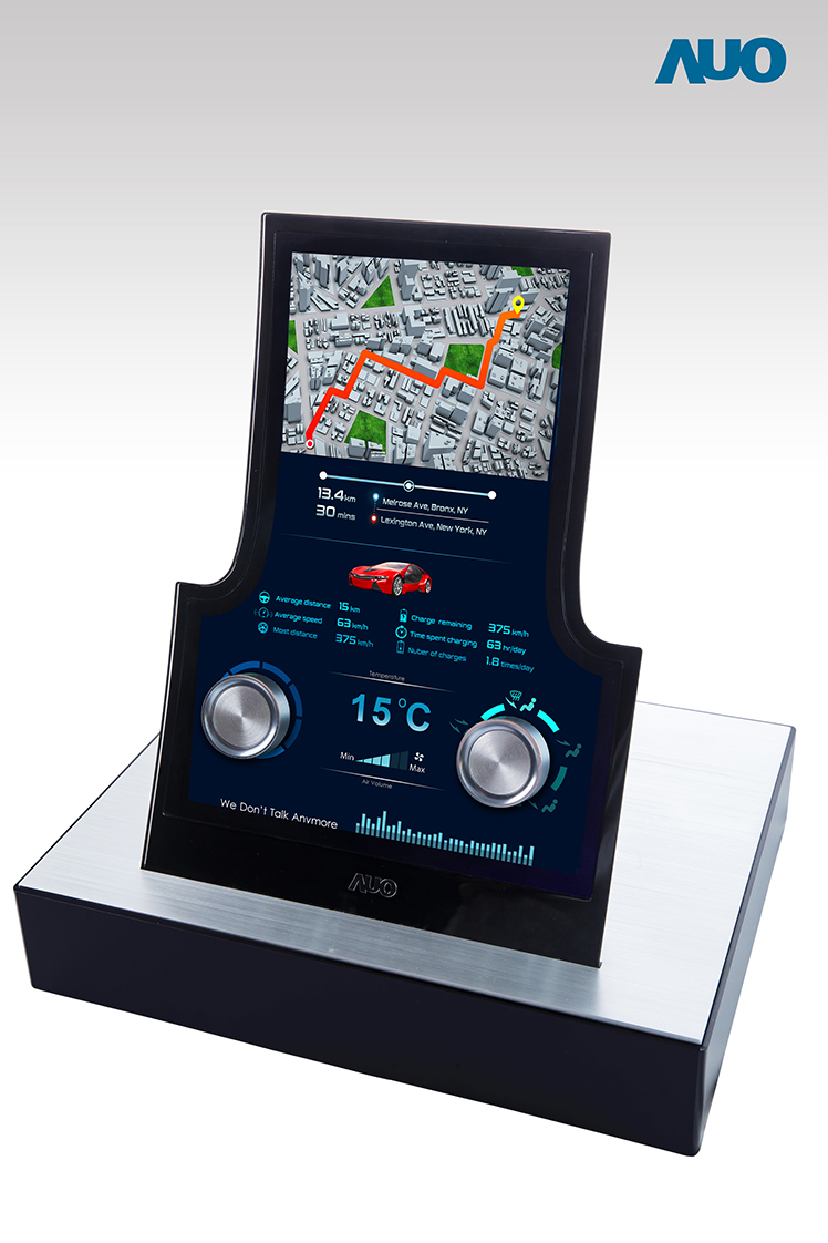 In the past years, AUO has devoted tremendous effort in the development of high potency car displays to match modern smart cars. For CID applications, AUO will show the world’s first(*)13.2-inch free-form display featuring high resolution of 1200x1600, NTSC 85% high color saturation and 1000-nit brightness, with the gate circuit moved to the display active area to release extra space on the sides for free-form designs. Meanwhile, symmetrical holes are drilled in the active area to allow for more design flexibility, such as having buttons and control dials installed.