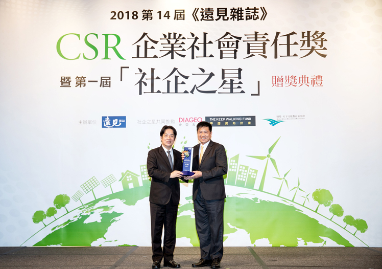 友達光電獲 2018 遠見 CSR 三項大獎,為獲獎最多企業,行政院長賴清德頒獎 (左),友達光電董事長暨執行長彭雙浪受獎(右)